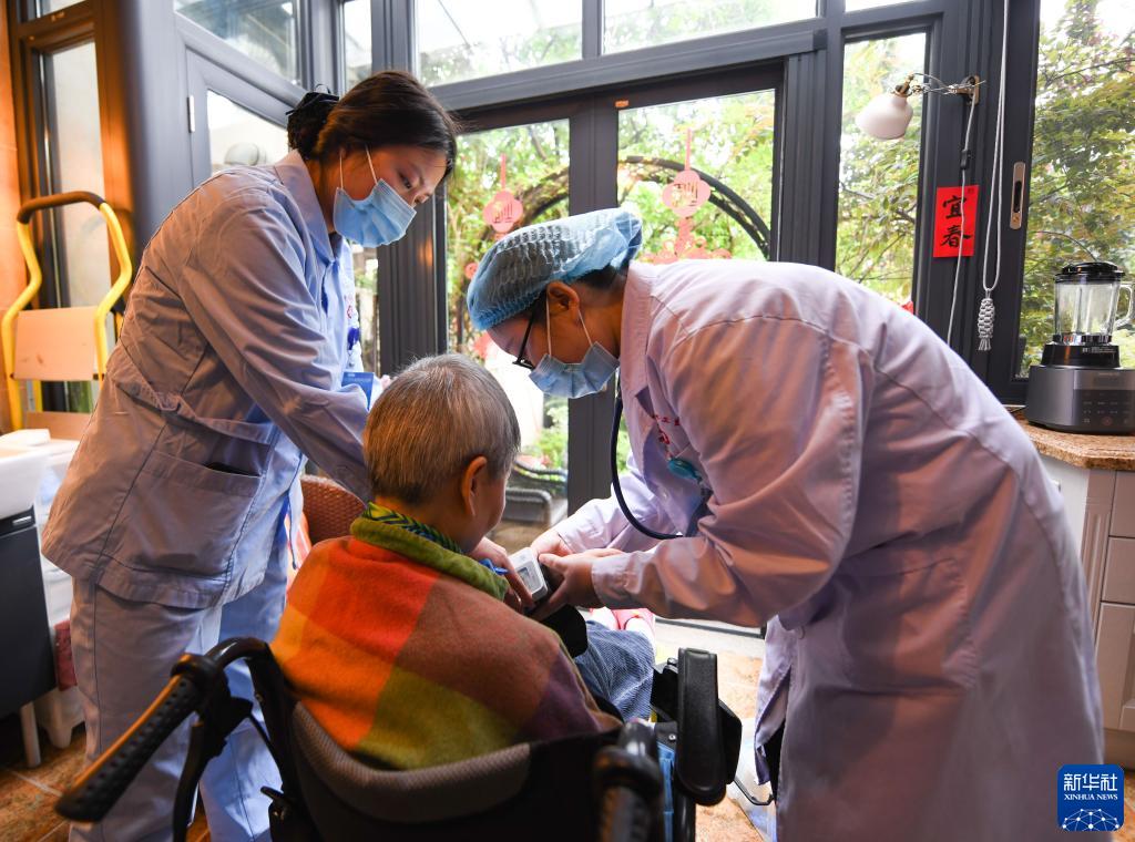 5月18日,在成都市温江区万春镇天乡路社区居民家中,家庭医生杨静(右)和护士黄佳妮(左)为居民叶茂群检查身体。