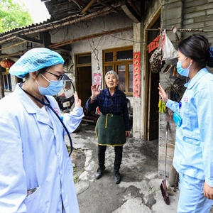 5月18日,在成都市温江区万春镇天乡路社区居民家中,家庭医生杨静(右)在询问居民叶茂群近期的身体情况。