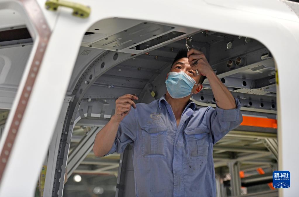 5月19日,在中国航空工业集团天津直升机有限责任公司车间内,工作人员在进行AC332民用直升机的铆接作业。