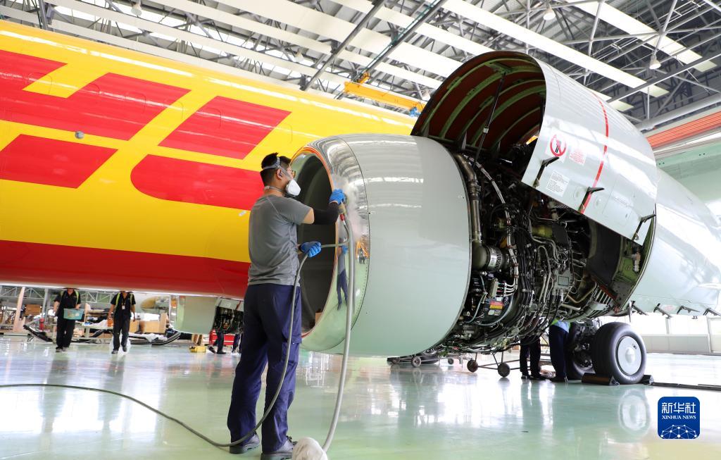 天津海特飞机工程有限公司工作人员在机库内进行维修作业(5月18日摄)。
