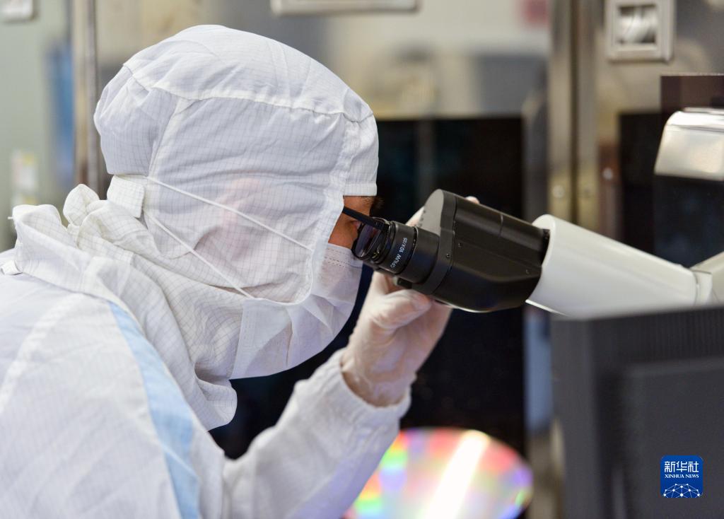 5月19日,华虹集团工程师在高清显微镜前检视晶圆。