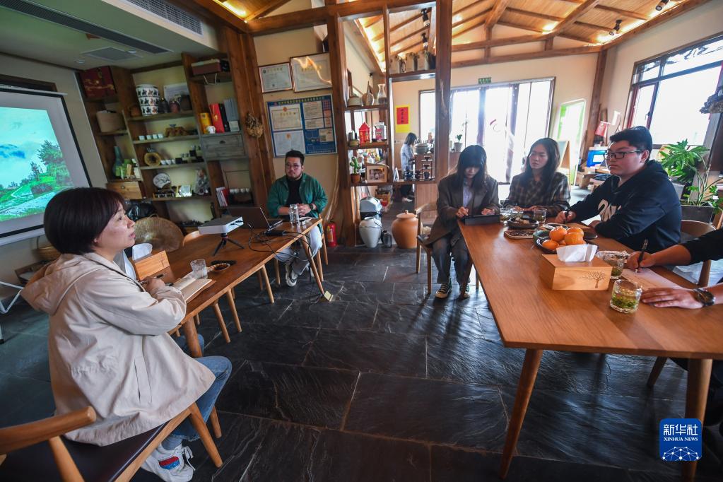 5月19日,潘青青(左一)与乡镇党员干部、新媒体工作人员等在民宿内商讨相见村“共富茶场”品牌推广及特色农产品开发。