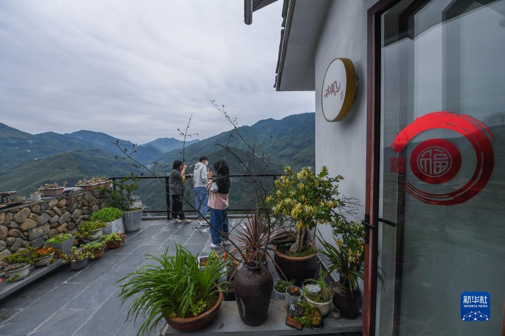 5月19日,游客在民宿“相见茶舍”的院子里欣赏山乡风景。