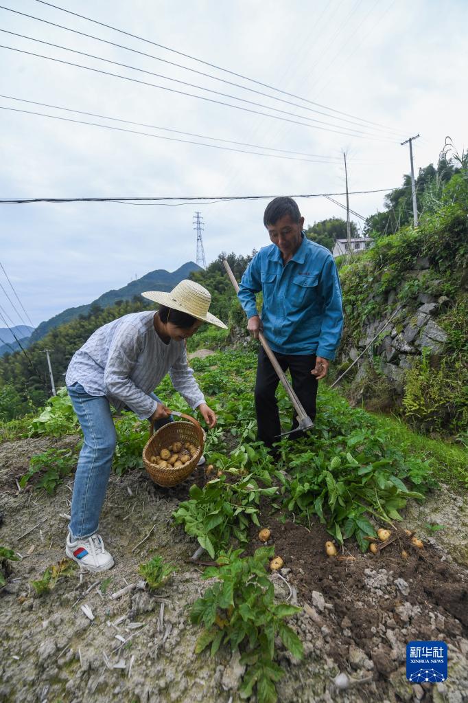 5月19日,64岁的村民徐社源(右)在相见村的高山蔬菜地里与潘青青一起收土豆。他种植的高山蔬菜作为特色农产品全部供给村里的民宿集群,每年能增收约4万元。