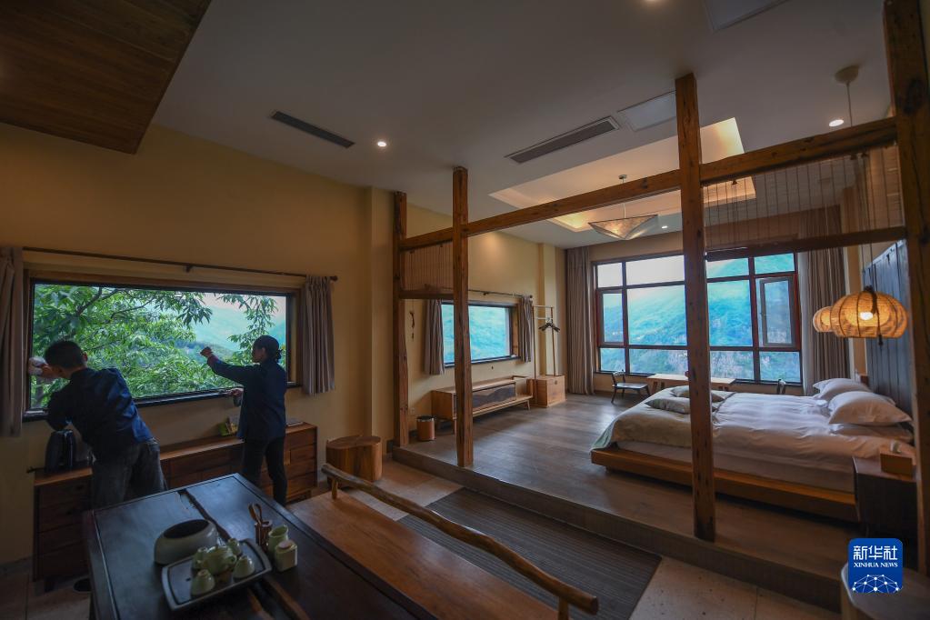 5月19日,作为服务员的村民在民宿内打扫卫生。