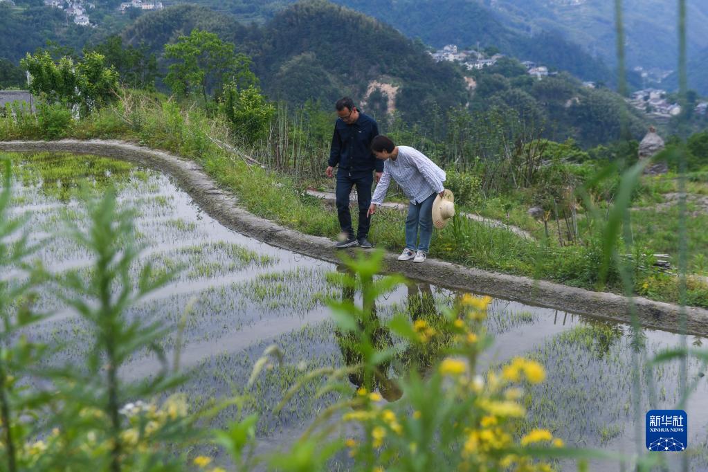 5月19日,潘青青(右)和丈夫张育铭在相见村查看梯田内水稻秧苗的长势。