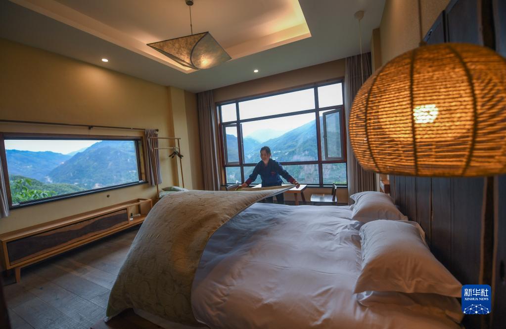5月19日,60岁的村民徐玉翠在民宿内整理房间。作为服务员,她每年能增收约5万元。