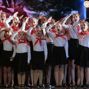 5月19日,少先队员在俄罗斯圣彼得堡参加纪念少先队成立百年晚会。