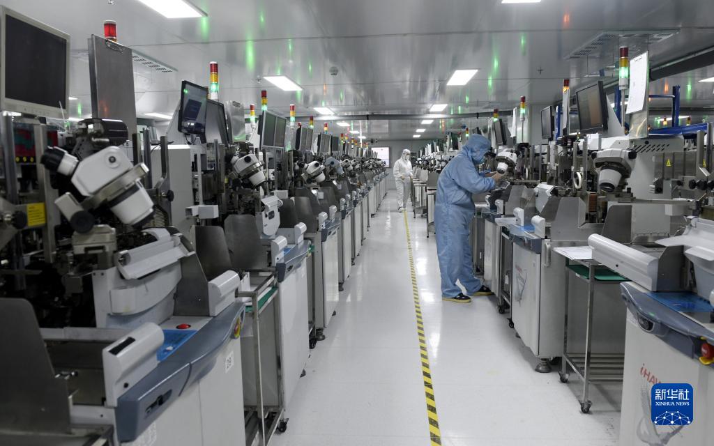 5月18日,山东省枣庄市峄城区古邵镇一家半导体产业园的工人在封装芯片。