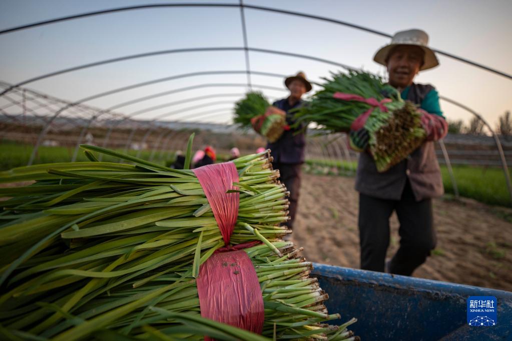 在宁夏灵武市郝家桥镇十里墩村,农民在搬运韭菜(5月19日摄)。