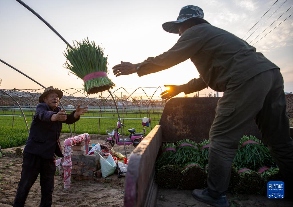 在宁夏灵武市郝家桥镇十里墩村,农民将韭菜装车(5月19日摄)。