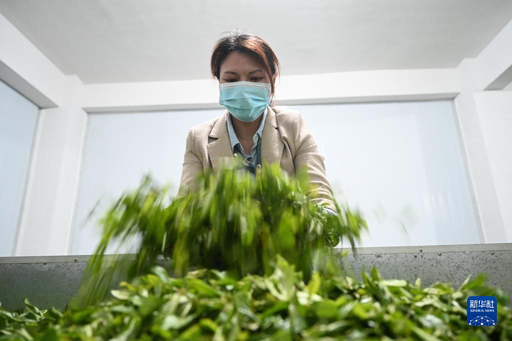 5月18日,福建省光泽县司前乡干坑林场村民陈美玲在翻抖茶青。