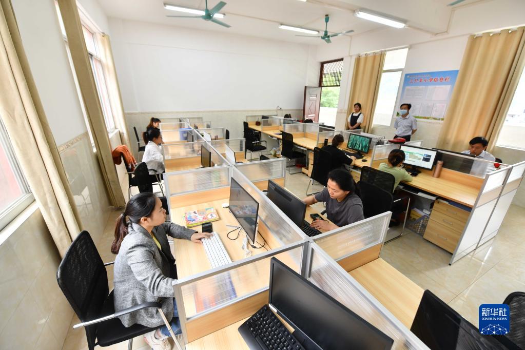 三只羊小学的老师在办公室里备课(5月18日摄)。