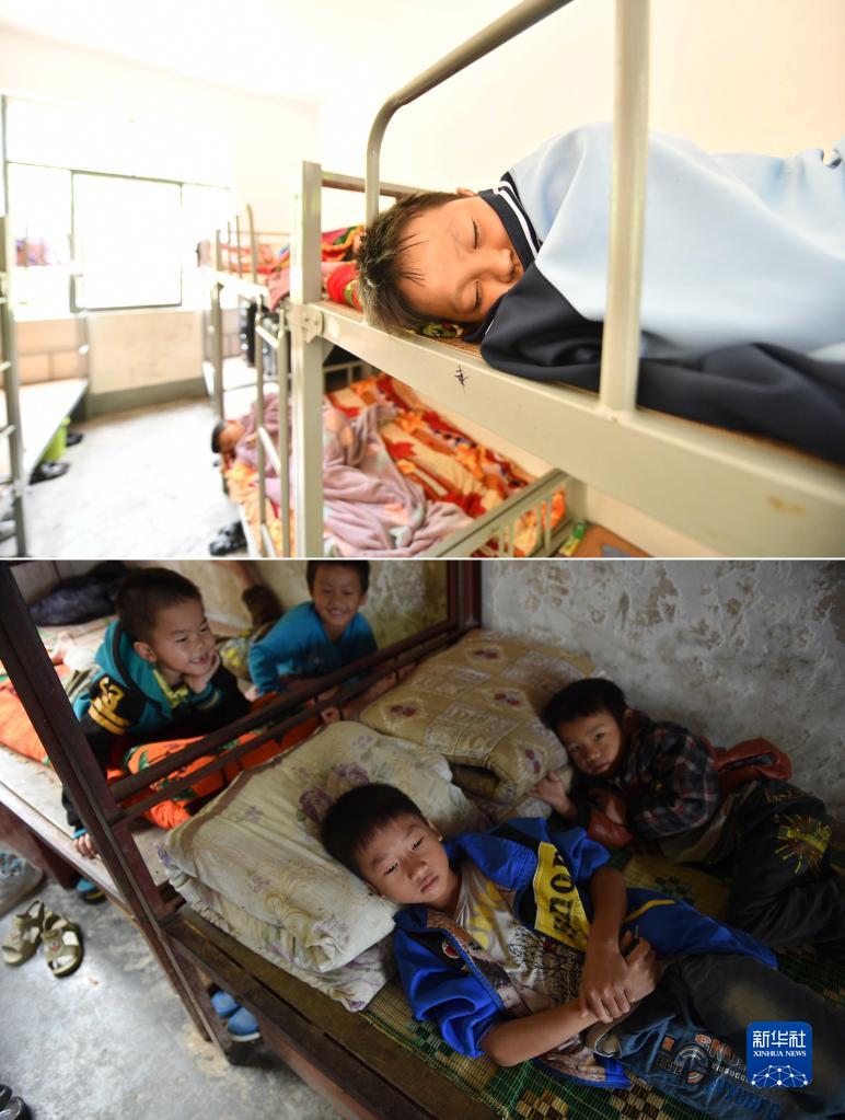 拼版照片:上图为三只羊小学的孩子们在睡午觉(5月18日摄);下图为2014年11月11日,三只羊小学的孩子们在睡午觉。