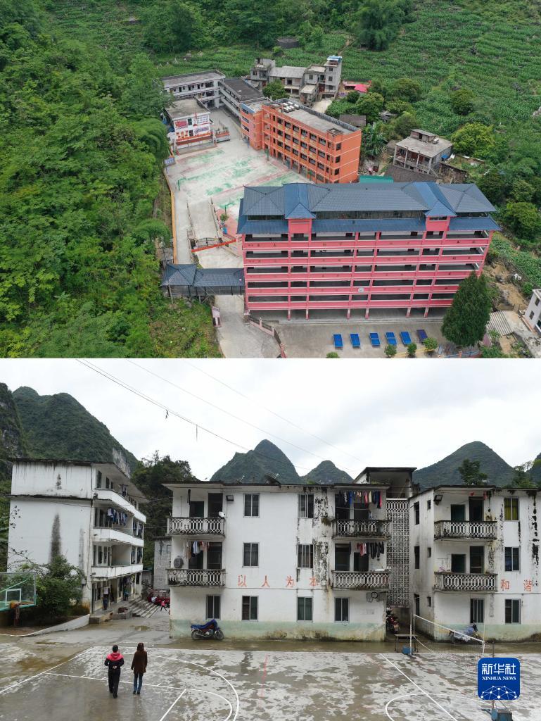拼版照片:上图为三只羊小学新貌(无人机照片,5月18日摄);下图为2014年11月11日的三只羊小学。