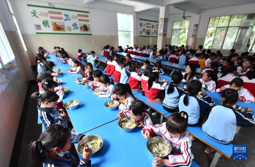 三只羊小学的孩子们在餐厅吃营养午餐(5月18日摄)。