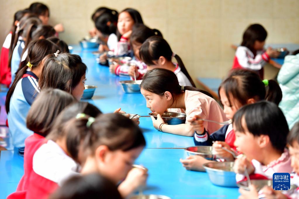 三只羊小学的孩子们在吃营养午餐(5月18日摄)。
