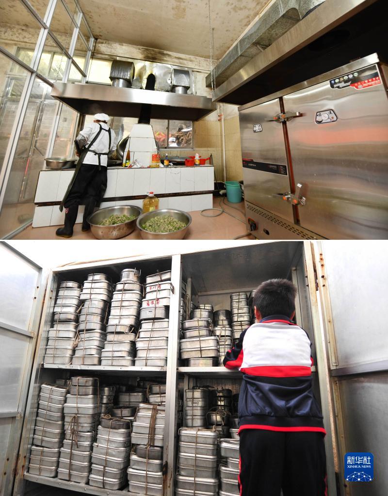 拼版照片:上图为在三只羊小学食堂,工作人员在准备营养午餐(5月18日摄);下图为2011年3月24日,三只羊小学的孩子们吃完午饭后,将装有大米和黄豆的饭盒放进蒸锅,准备晚餐。
