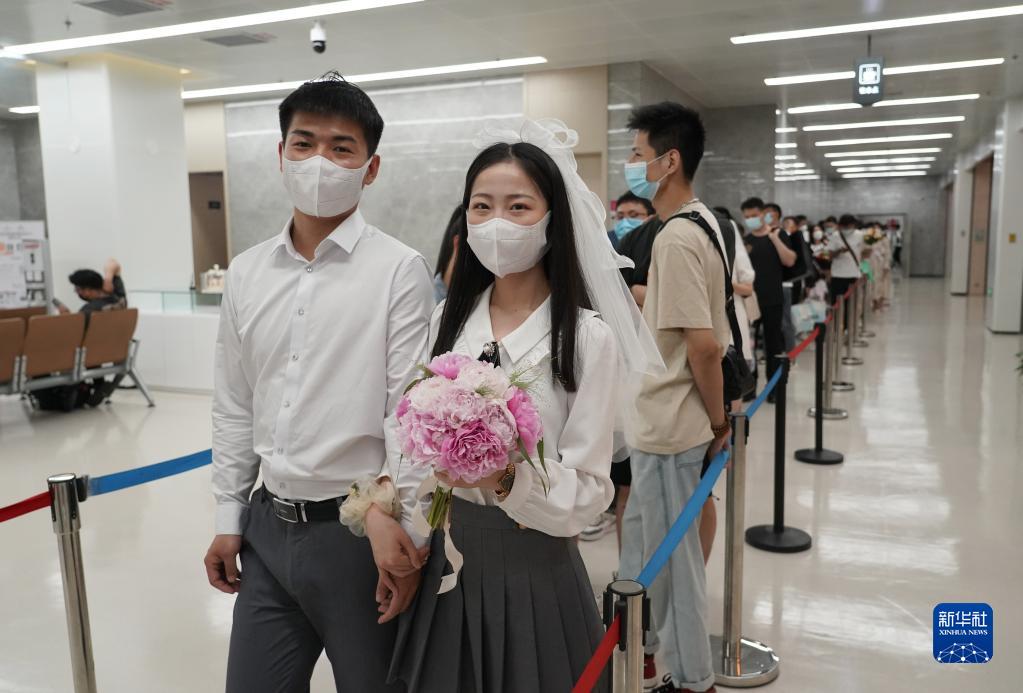 5月20日,在西安市未央区民政局婚姻登记处,新人们排队办理婚姻登记手续。