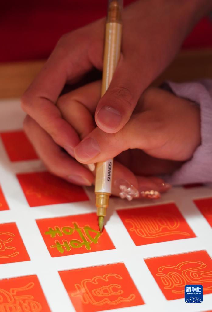 5月20日,在西安市未央区“汉文化”沉浸式婚姻颁证大厅内,一对新人在“百喜图”上描写喜字。