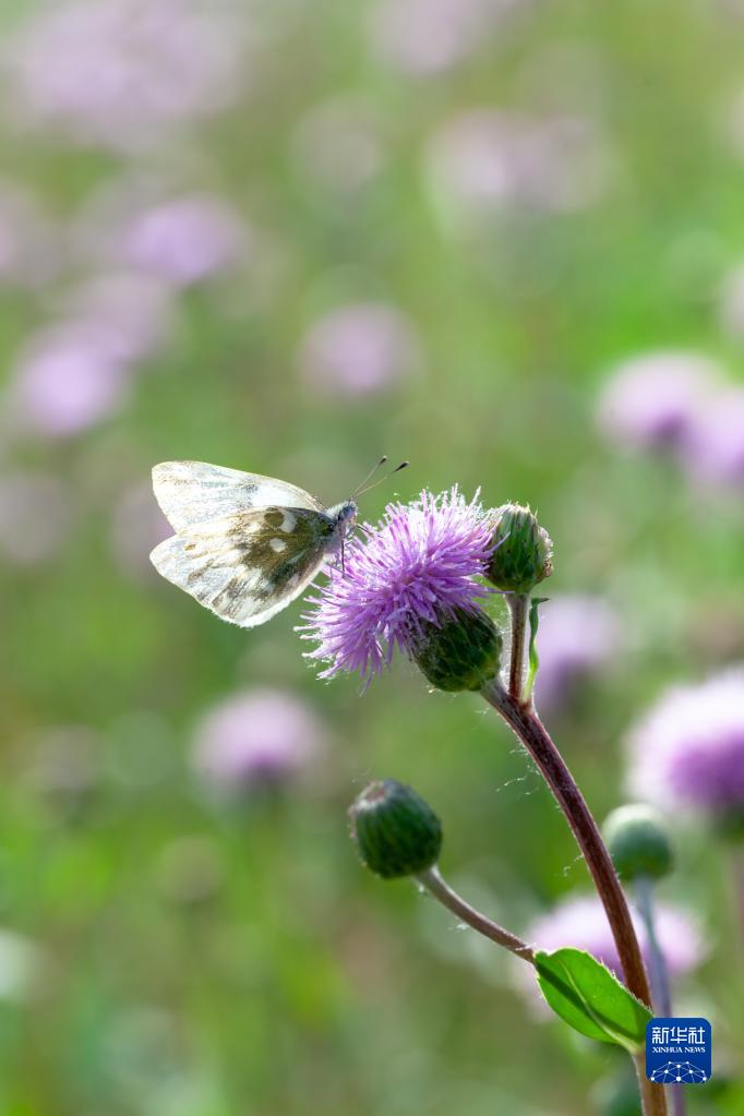 5月13日,山东省高青县常家镇一处农田,一只蝴蝶在花间吸食花蜜。