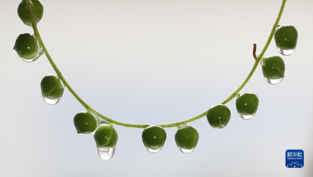 5月11日,在云南腾冲市,多肉植物上挂满雨珠。