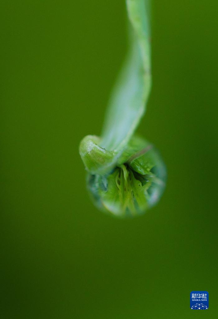 5月14日,在贵州省黔东南苗族侗族自治州丹寨县龙泉镇交圭村田边,野苦菜叶上的雨珠映出了茂盛的野苦菜叶。小满三候中,一候苦菜秀,说的就是小满时节,苦菜枝繁叶茂。