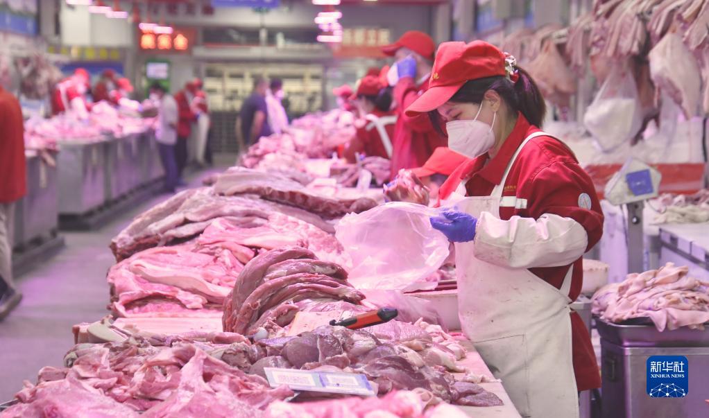 5月20日,新发地市场的肉类批发商户在摊位上工作。