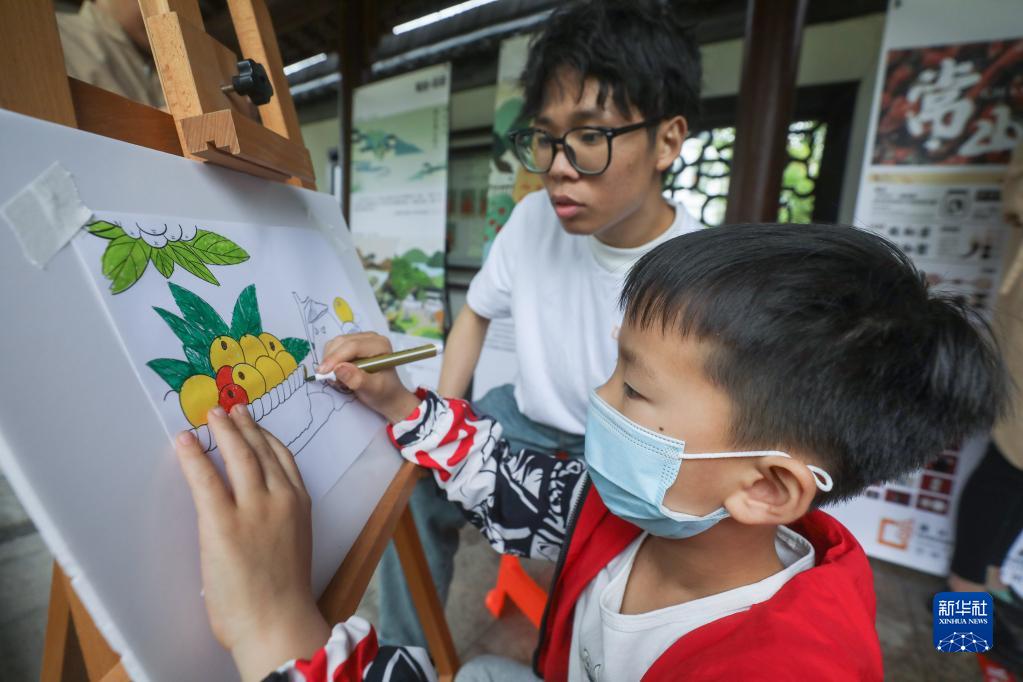 5月20日,小游客在参加画枇杷比赛。
