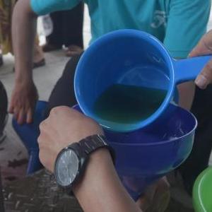 5月20日,在印尼雅加达,工作人员灌装食用油。