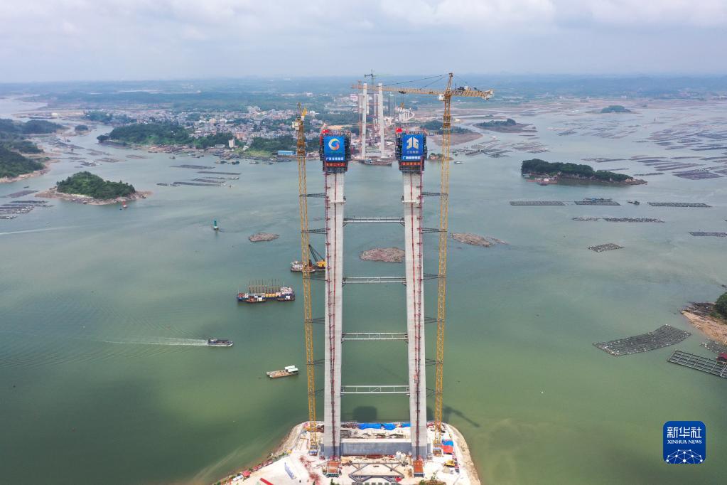 广西钦州市龙门大桥东主塔建设现场(5月20日摄,无人机照片)。