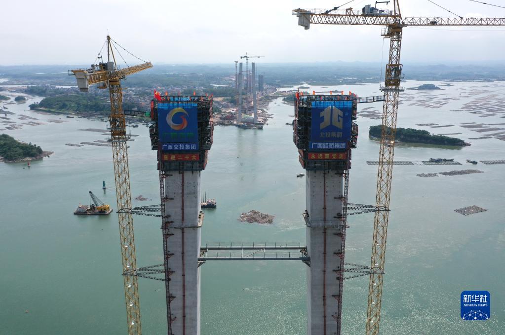 5月20日,工人在广西钦州市龙门大桥东主塔建设现场施工(无人机照片)。