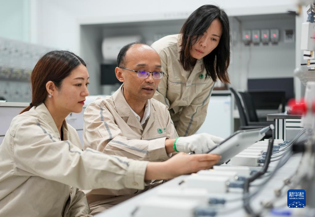 5月20日,计量专家肖冀(中)和同事在国网重庆市电力公司的计量全性能实验室内进行计量专业实验与研究。