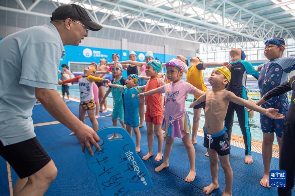 5月21日,小朋友们在志愿者的带领下练习落水时的自救姿势。