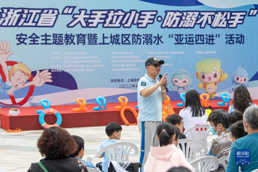 5月21日,志愿者为参与活动的小朋友讲解防溺水安全知识。