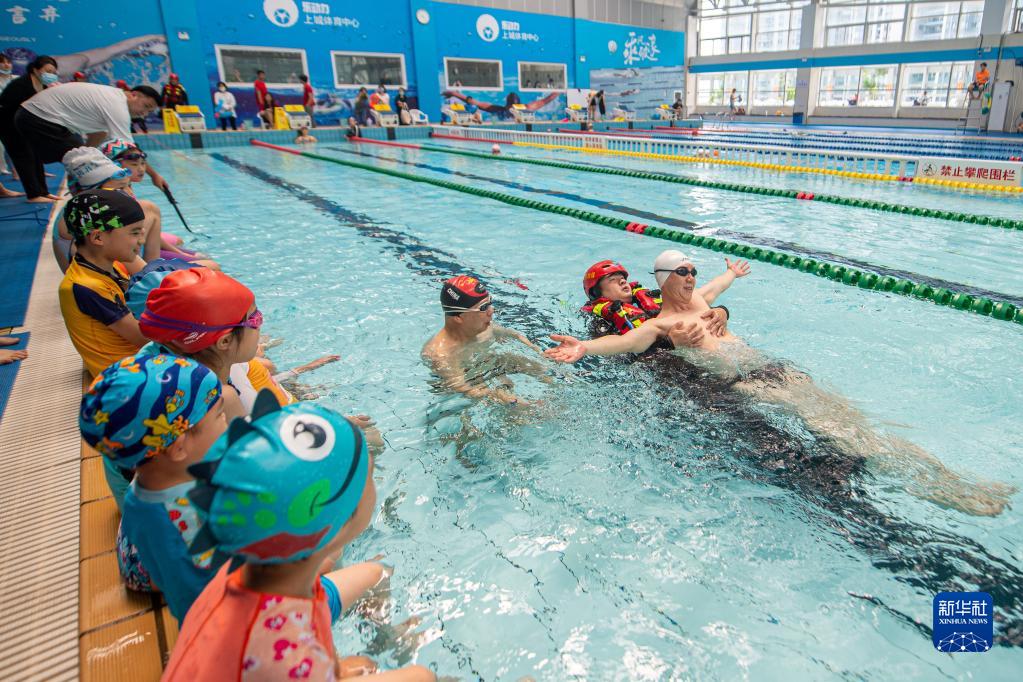 5月21日,志愿者和仁泽救援队队员为小朋友演示如何正确救援落水者。