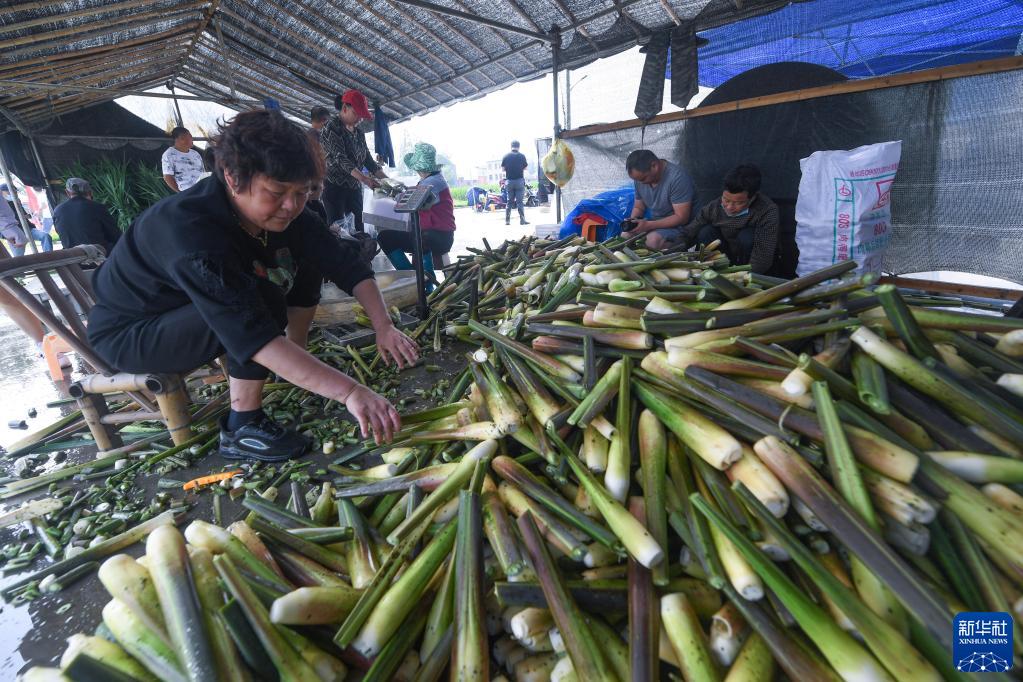 5月21日,张堰村茭白种植户在处理刚收获的茭白。