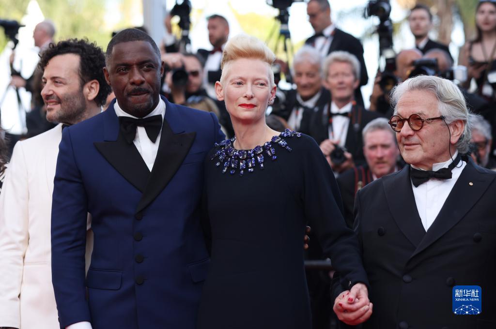 5月20日,在法国戛纳举行的第75届戛纳国际电影节上,影片《三千年的渴望》的导演、编剧乔治·米勒(右一)、演员蒂尔达·斯文顿(右二)和伊德瑞斯·艾尔巴(左二)抵达首映式现场。