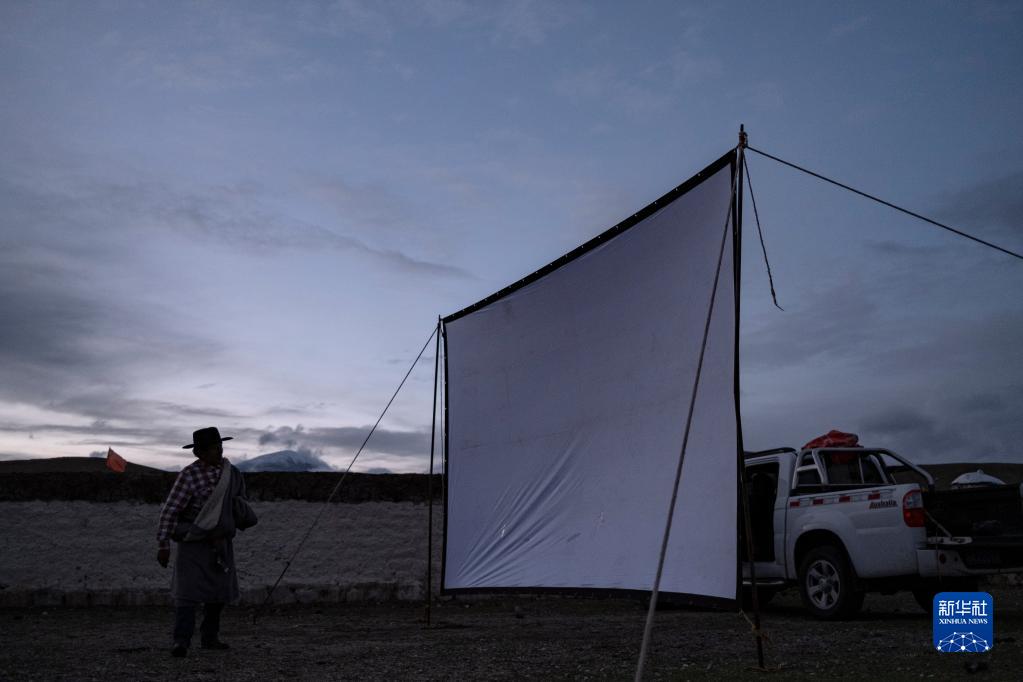 在西藏当雄县巴灵村,罗珠在检查搭建好的幕布(5月20日摄)。
