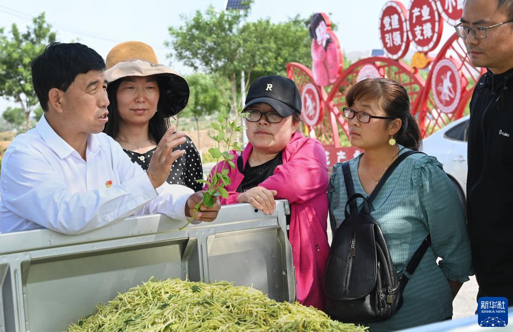 5月21日,王春颜(左一)在村头金银花收购现场向前来参观的客人介绍金银花的药效。