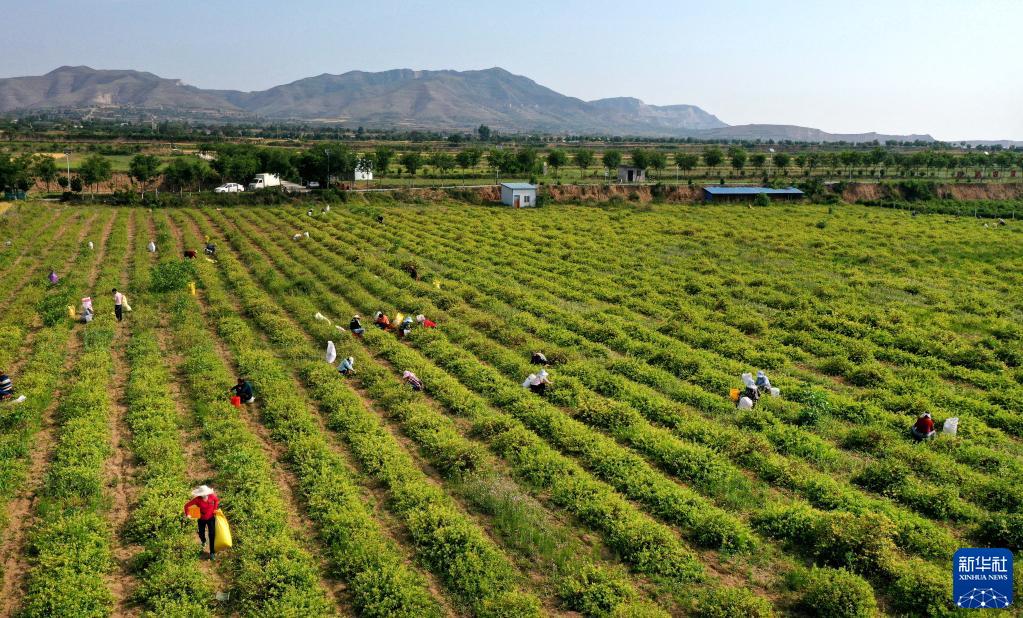 5月21日,闫家村村民在金银花基地采摘金银花(无人机照片)。