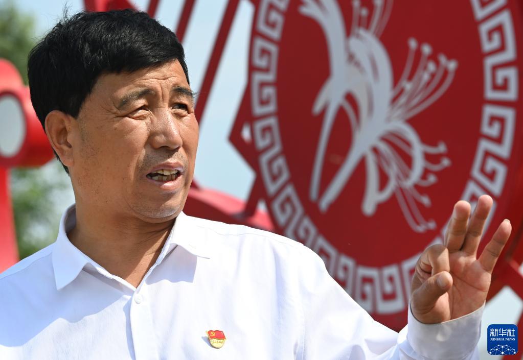 5月21日,王春颜向参观客人介绍全村金银花产业发展情况。