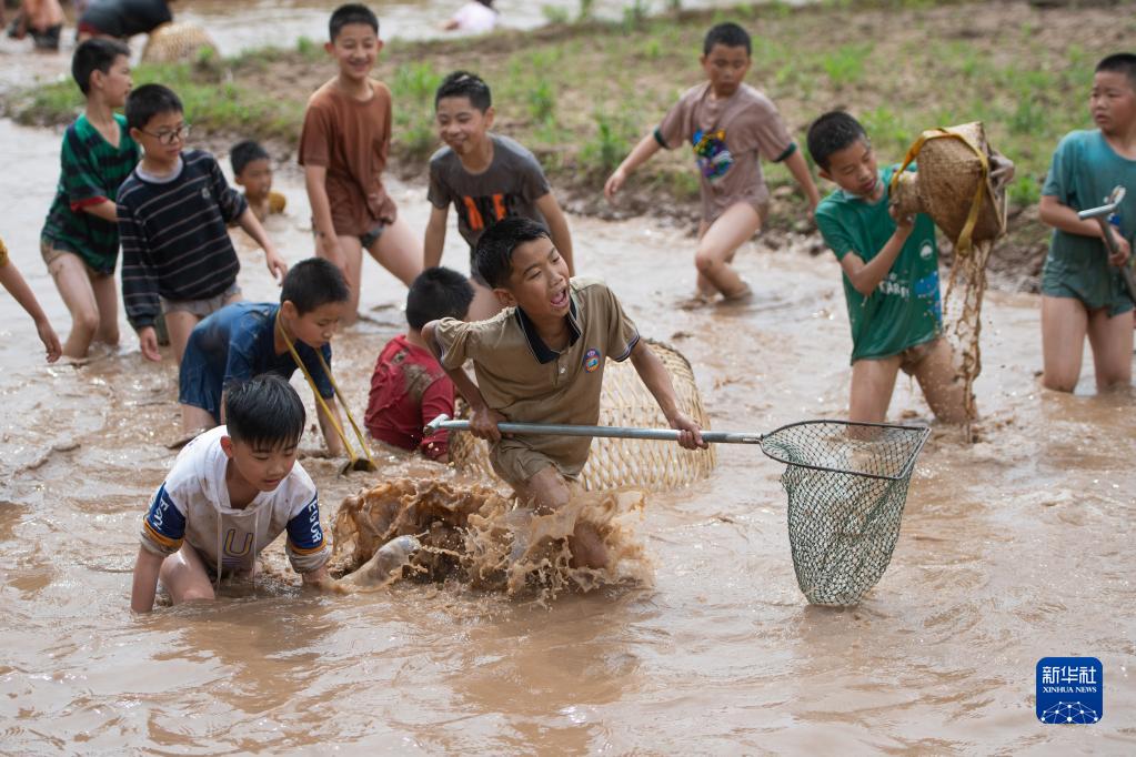 5月17日,在湖北省荆州市中小学生社会实践基地,学生体验鱼塘捕鱼。