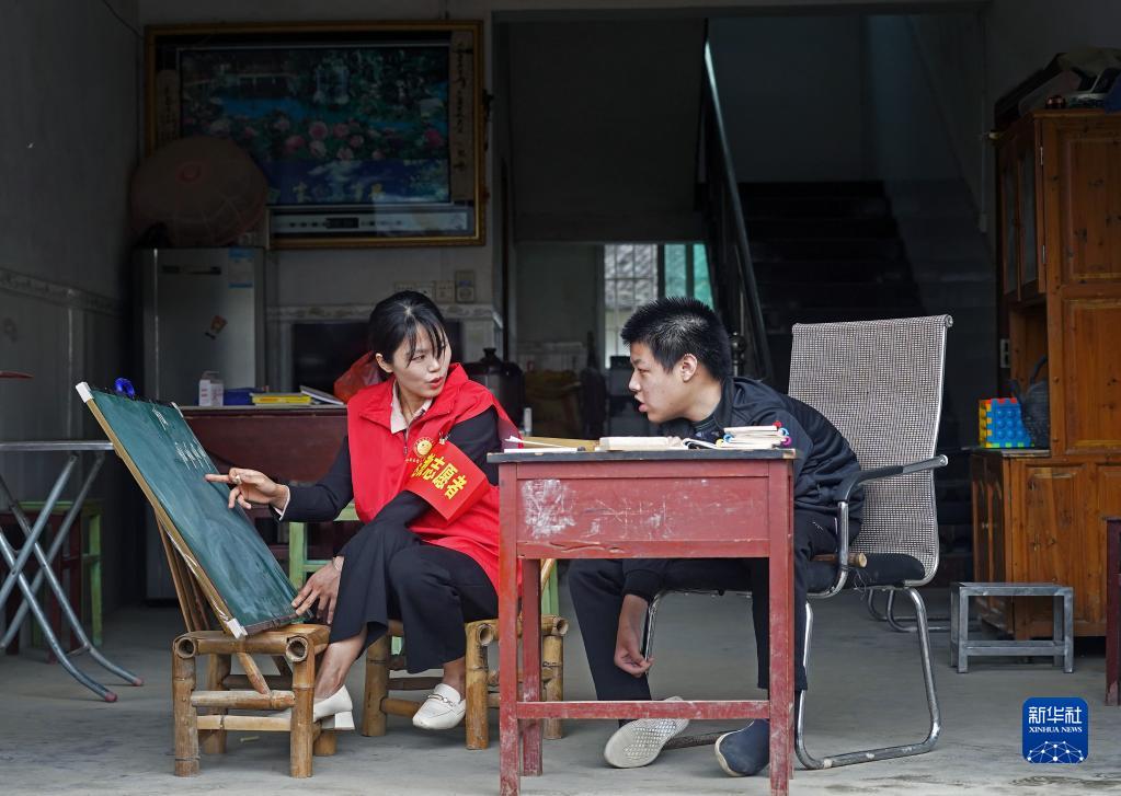 在江西省万安县宝山乡黄塘村,送教老师赵珑娟(左)在小翔家中给他上语文课(5月13日摄)。江西省万安县宝山中学的赵珑娟老师给肢体一级残疾的小翔送教约一年半时间,现在小翔已能写下几个简单的汉字。