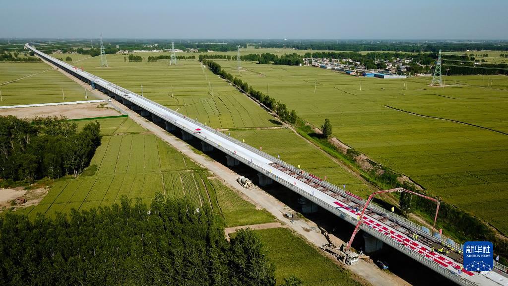 5月21日,在济郑高铁山东长清黄河特大桥施工现场,中铁上海局工作人员进行无砟轨道施工作业(无人机照片)。