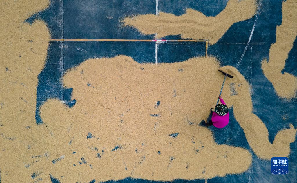 5月21日,海南省琼海市大路镇青天村的农民在晾晒稻谷(无人机照片)。