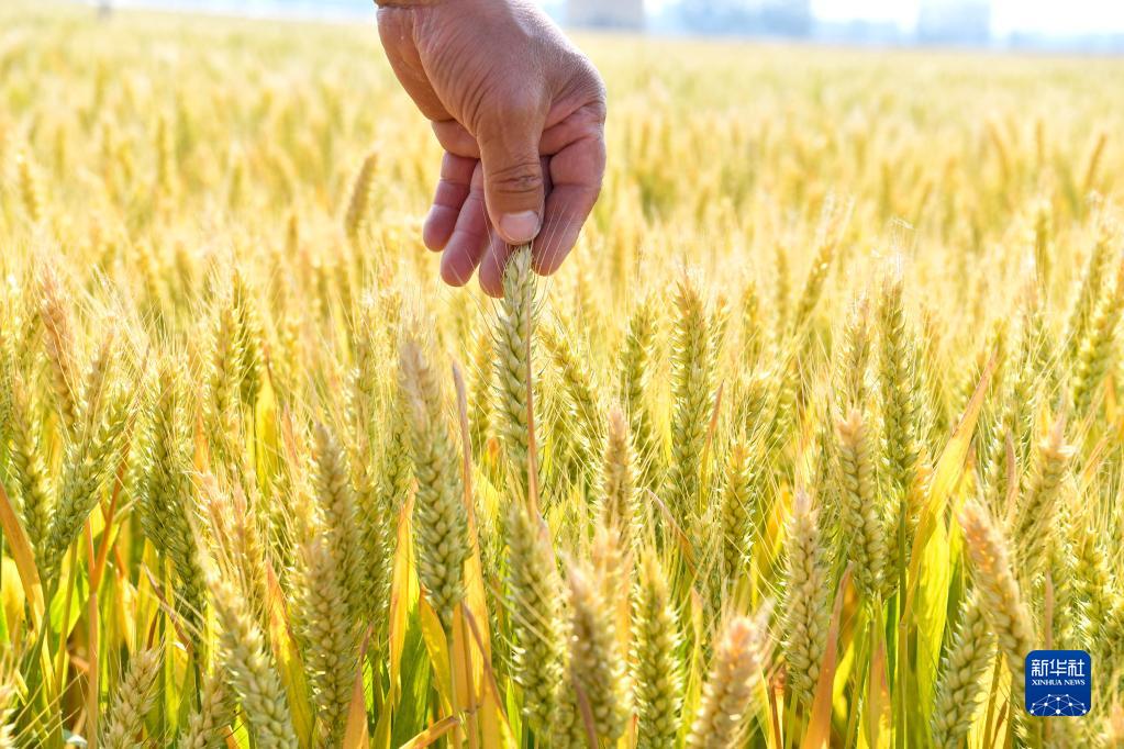 5月21日,在安徽省亳州市谯城区赵桥乡,农民在麦田查看麦粒饱满程度。