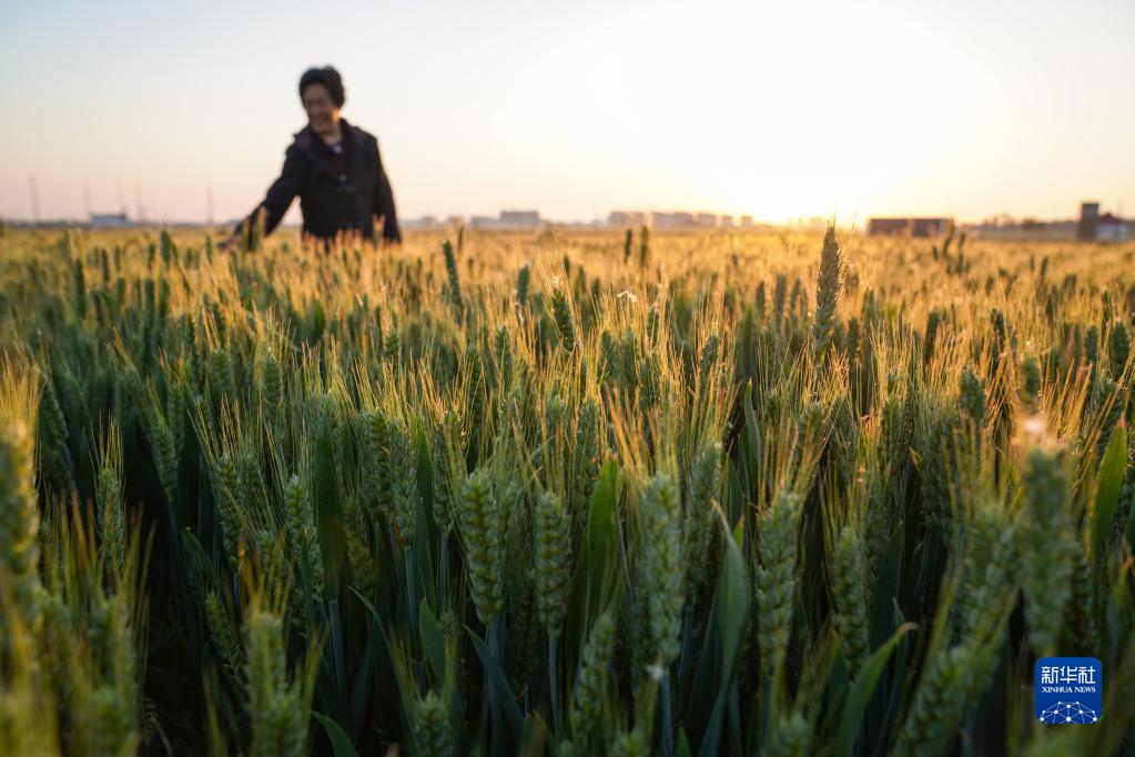 5月21日,河北省邢台市内丘县后鲁亭村农民在麦田查看小麦长势。