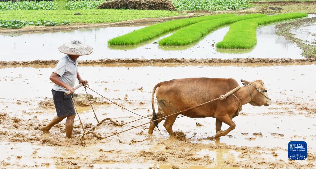 5月21日,在湖南省永州市江永县潇浦镇三元宫村,村民在翻耕水田。