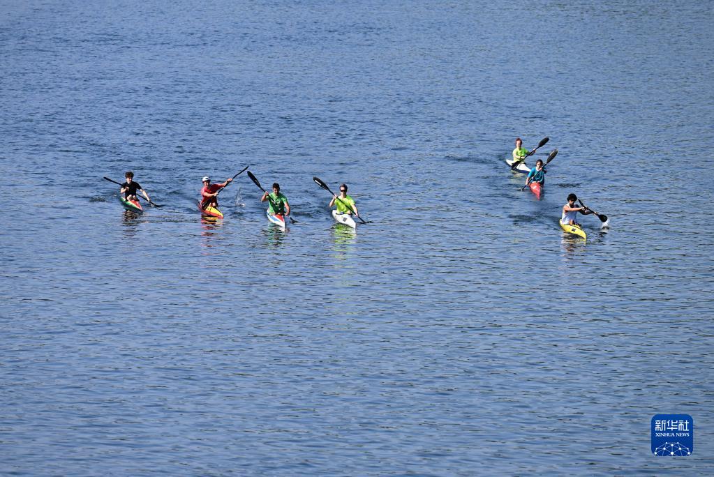 5月21日,人们在意大利都灵划船消暑。